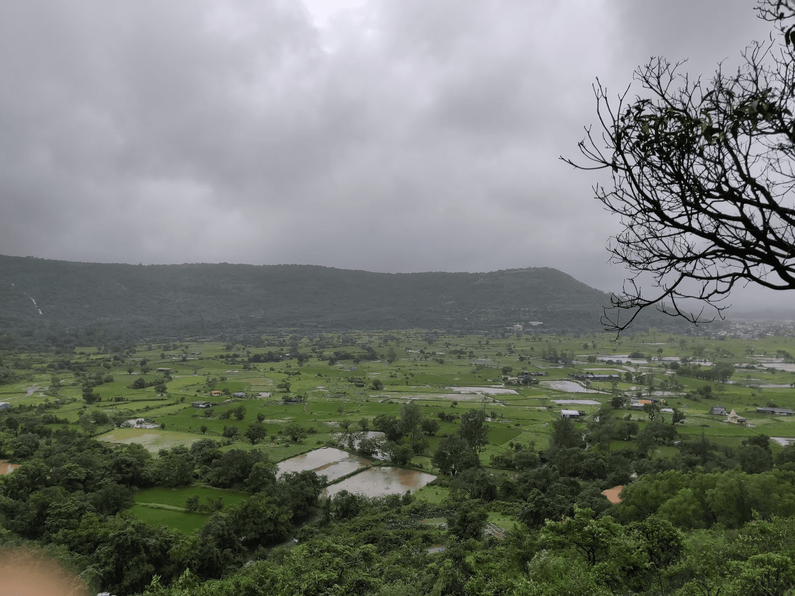As we move towards the last cave, we were greeted by a cascading waterfall and the view of a fort (may be Lohagad, Visapur?) beyond it.