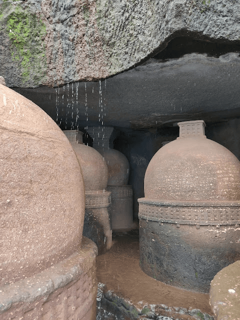 There are about 150 steps to climb the 400 feet to the caves. The rains had created numerous rivulets and falls along the steps which made the climb a breeze. The view below from the top too was awe-inspiring. Monsoons had carpeted the land lush green below. The rice fields, temples and red-tiled houses set against the Sahyadris were a treat to the eyes.