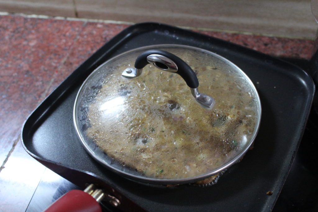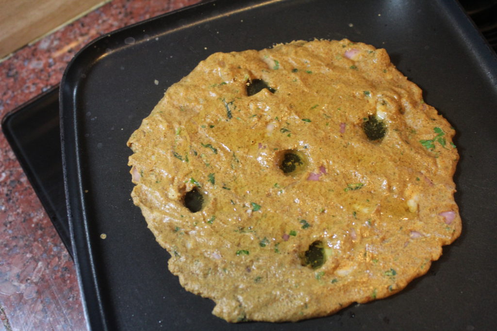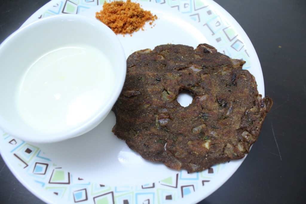 Bhajni che thalipeeth served with curd and peanut chutney Bhajni che Thalipeeth is a savory pancake and a popular Maharashtrian breakfast. We, many a times, have it for dinner as well. It is a very nutritious dish with a variety of grain cereals and pulses ground together. Bhajni (meaning: roasted) is the flour used to make thalipeeth. The recipe for bhajni is given below. Once the bhajni is ready, it can be stored for months together, preferably in an air-tight container to retain its fragrant aroma. Ingredients for Bhajni che Thalipeeth: Bajri- 750 gms Jowar- 750 gm Rice-500 gms Wheat-500 gms Chana dal-500gms Dhania seeds – 250 gms Whole udid black dal (with skin) – 250 gms Soya beans seeds– 250 gms Dry roast all the items individually on a slow flame and grind it together to a fine powder. Store it in a cool, dark place. I sometimes keep it in the freezer by sealing it in a Ziploc. It stays good for around 4-6 months in the freezer. Recipe for Bhajni che Thalipeeth: Makes 4-6 thalipeeths of medium size 2 cups bhajni 2 finely chopped medium-sized onions 1 cup finely chopped fresh coriander leaves 2-3 finely chopped green chillies 2 tsp red chilly powder 1 tsp turmeric powder A pinch of asafoetida Water for kneading the dough Salt to taste Mix all the above ingredients in a mixing bowl and make a pasty dough. Once the dough is ready, slightly grease/wet your palms and flatten the dough ball onto a wet plastic sheet/butter paper into a round pancake. It is important to wet your palms and the plastic sheet so as to avoid the sticking of the dough to your hands or to the plastic. Now carefully lift the thalipeeth off the plastic by turning it upside down onto the heated griddle. Sometimes, I even flatten the dough ball into a pancake directly on the griddle by sprinkling water which helps me spread it evenly. Keep the heat on moderate to allow it to cook evenly. Thalipeeth is a thick pancake and needs to be cooked on moderate heat/flame to allow its even cooking. Form holes on to the thalipeeth with your fingers. This helps in cooking it evenly. Drizzle a few drops of oil on the sides of the thalipeeth and in the holes to shallow fry it. Cover the thalipeeth for a few minutes with a lid. Flip over the thalipeeth and cook it on the other side as well. Your crispy thalipeeth should be ready soon. In my mom’s house, it is usually served with a dollop of home-made fresh butter and a side of mango pickle. I like it with curds and my husband and son enjoy it with desi ghee. Tip : You can also add vegetables of your choice to thalipeeth such as grated carrots, cucumber, methi, spinach to give it that extra vitamin punch! Click here to get another variation of this thalipeeth which can be made rather quickly or without a bhajni.