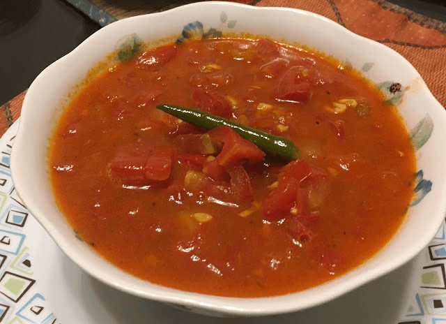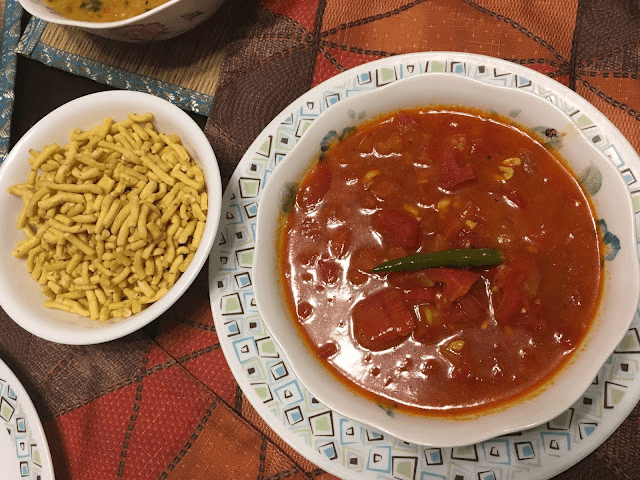 Sev tamata is a very simple and quick tomato curry garnished with sev and lapped up with a roti. It is a kathiawadi dish and has its own variations across kitchens. Here is the recipe from my kitchen: