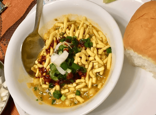 Serve the usal in a deep bowl or a vaati. Garnish it with coriander leaves, chopped onions, the sweet and sour tamarind-dates chutney and a spoonful of tarri. Add the sev on top and squeeze lemon juice over it. Mix it well and scoop the deliciousness with pav.