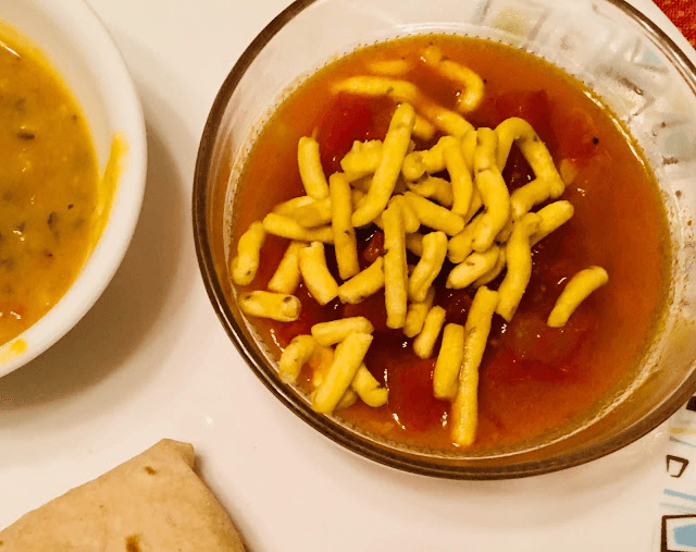 The tomatoes should not become mushy but should retain some of its chunkiness. Add water to adjust the consistency. Here, the dish should have a slightly soupy consistency for the sev to absorb the flavourful juices. Again, cook it covered for a few minutes, adjust the seasonings as per taste and the dish is ready.