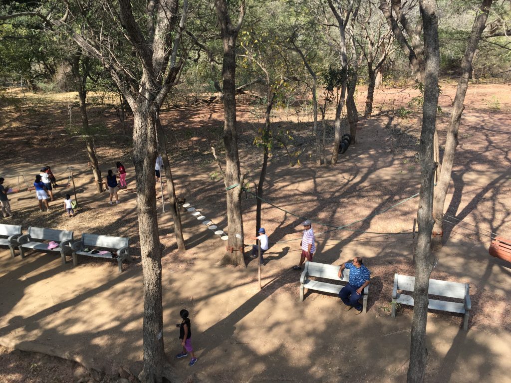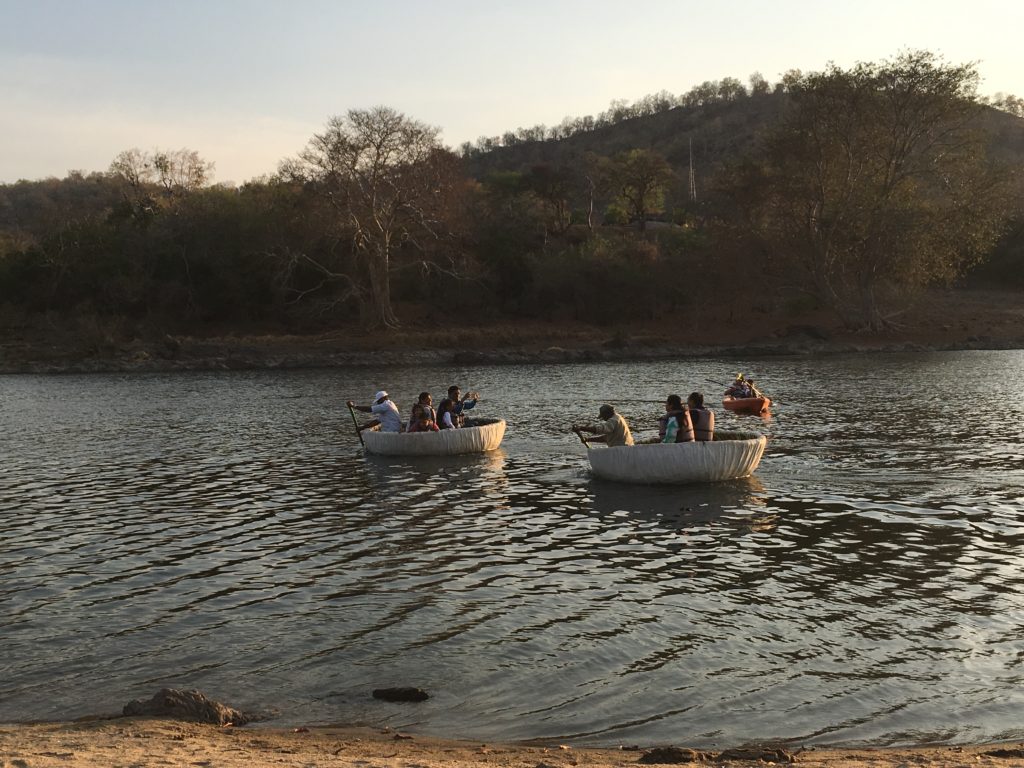 Sunset across the Cauvery We were excited that we were finally going to Bheemeshwari, a name synonymous in my mind with the gushing Cauvery, Mahseer fishing , tented accommodations, verdant forests and thrilling adventure activities. For reasons unknown to even us, Bheemeshwari had always taken a backseat all these years, when it came to deciding on weekend getaways. But this particular weekend, we had finally booked Jungle Lodges at Bheemeshwari and were raring to go. My son was super excited with the fact that we were going to stay in a tent. He asked us numerous times as well if a tent was strong enough to keep us safe from the wild animals of the jungle! ;) It took us less than 3 hours to get there on a Saturday morning from Bangalore. Check in at the Jungle Lodges Resort (JLR) was at noon. So we started from our house at around 8 am giving ourselves ample of time for a leisurely breakfast stop somewhere along the route. We took the Kanakapura Road, which is a double lane road lined up with renovation at numerous places. So our drive was slow but smooth. There were not many restaurants in sight as we passed by, but around 10 am, we spotted a MTR sign tucked away in a corner of the road. Soon enough we parked our car in its parking lot and seated ourselves for a happy meal :) Breakfast at MTR Kanakapura Road (NH 48) With a satiated appetite, we proceeded on our way to JLR. The JLR folks had already called on us and asked us to take the Halaguru route over the Sathnur route. The latter one apparently was not in a usable condition. The ride to Bheemeshwari was quite smooth contrary to the many reviews we read online. Traffic was light and the weather cheerful. We breezily made our way to the gates of JLR. Halaguru Gate Signboard On arrival, we were greeted by a group of monkeys in the premises, who were promptly shooed away by the guard. After checking in, we were led to our tent. I was really happy with the resort at first sight. Our tent was right opposite the banks of the Cauvery and it felt as if we truly were in a ‘jungle’ resort! The tent was spotlessly clean and spacious for the 3 of us. The hammocks and swings outside each tent added to the charm and comfort of the resort. The resort was full for the weekend and yet it did not seem crowded. Climbing nets, ziplines, machans, rope walks, dotted the place and sought to prepare us for the upcoming adventure activities. Our tents Activity area from atop a tree The restaurant/dining area was a bit further down the resort. We all had to walk down the jungle terrain for about 100-150 metres to reach there. The dining area was surrounded by log huts/cottages and was spectacularly located across the wide, inviting banks of the Cauvery. Coracles and kayaks were kept on one side of the dining area while a barbecue grill was on the other side. The charm of the resort is hard to define. It is not sophisticated like the other luxurious resorts we have been to but still has all the facilities of one. It is truly ensconced in the lap of nature. One gets the feel of being in a forest setting inspite of being in a resort! The walk to the dining hall The buffet lunch was wholesome and delicious. It was a mix of South Indian and North Indian fare and felt homely. The entire dining area was netted and secure from the monkeys while letting in the cool breeze from the Cauvery. Delicious goodness :-) Dining hall across the river The adventure activities started soon after lunch. We lazed for around 30-40 minutes after lunch before we started with the fun - ziplining, all the rope walks (Burma loops, Elephant walk..), etc. Soon after that, we were called for the coracle ride but not before we were served tea and cookies at the restaurant. Burma Loops Elephant walk It was around 5pm by the time we reached the banks of the Cauvery. The sun had started setting spreading a nice orange glow in the horizon. The breeze was cool and refreshing. Our boat man (coracle man!) took us around for a good 45 minutes in his endeavour to help us spot some crocodiles. However, we were not lucky enough! We had to make do with the mud marks left behind by these reptiles. The JLR staff deserve a special mention all this while - right from the bellman, the adventure activity personnel, the dining area staff to the coracle boatmen . All of them made us feel comfortable and at ease. This courteous service added a special touch to our stay. JLR Cabin At around 7pm, it had become pitch dark and the path to the dining area was dimly lit with lamps hanging on the posts. Of course, it has to be dimly lit so as to not attract any wild animal towards us :). Armed with torches and flash lights from our mobiles, we made our way to the bonfire set up near the dining area. Chunks of marinated paneer, and veggies were being barbecued alongside. Not to forget the juicy chicken pieces for the meat lovers! The sky was amazingly clear there to allow us to indulge in star gazing. Seated around the bonfire, enjoying the lovely barbecue, and gazing at the twinkling stars above, made it a night to remember. Bonfire Veg Barbecue No cell phone service, no internet, no TV for the entire day and yet we had lots to do and enjoy! Camping definitely did wonders for our sleep as well. The next day started early for us at 6 am. We did not even need an alarm to get us up and going.We were all refreshed and invigorated for the morning’s adventure. Our guide led us through the forest on a trekking path atop a small hill. The watch tower there helped us get a good panoramic view of our trek route. We could also spot the JLR tucked up as a tiny dot in the trees yonder. While descending, however, we took a different route along the river banks to get back. The walk through the forest with monkeys jumping around on the trees, listening to an occasional trumpeting of the elephant nearby, all made for an exciting trek back to the camp. Trek route from atop a watch tower Cauvery bank - laid dry in areas due to 
