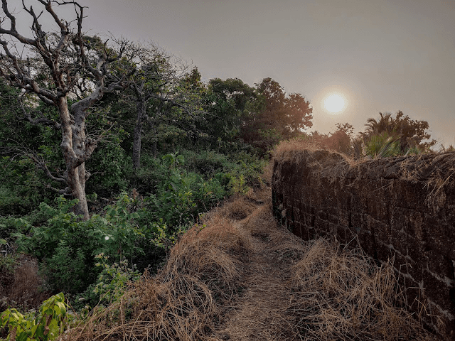 After entering the fort, one is taken in by the solitude of the place. There are hardly any visitors unlike the crowded sites of North Goa. The place is almost entirely covered with trees making the fort inaccessible at certain places. However, the chapel of St. Anthony is right in front of the entrance on the left amidst a clearing. A well-trodden path along the church takes us to the western walls of the fort sitting tall on the steep cliffs along the Arabian Sea. One can keep walking along the walls of the fort to explore its charm. A few turrets along the wall, opening out to the sea are the best spots to hang around and take in the views. Sunset is the best time to enjoy the this place before dusk sets in.