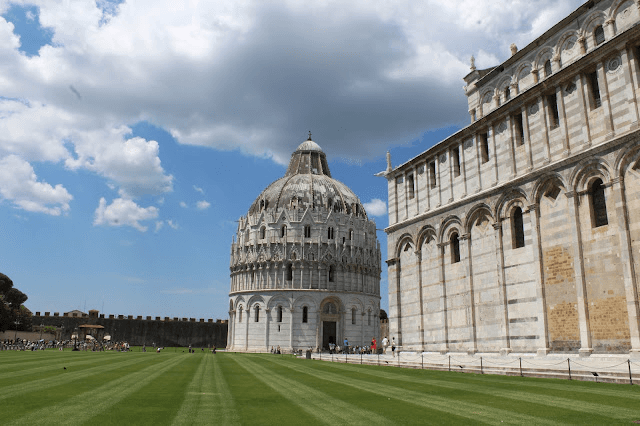 Thirty minutes later, we reached the walls of Piazza dei Miracoli in Pisa. This is a walled piazza housing the Cathedral, the Campanile (free standing bell tower) alongside it, a Baptistery in the background and a cemetry. The grounds of the piazza are sprawling with lawns and paved paths leading to the structures. The piazza also houses a museum inside its walls.