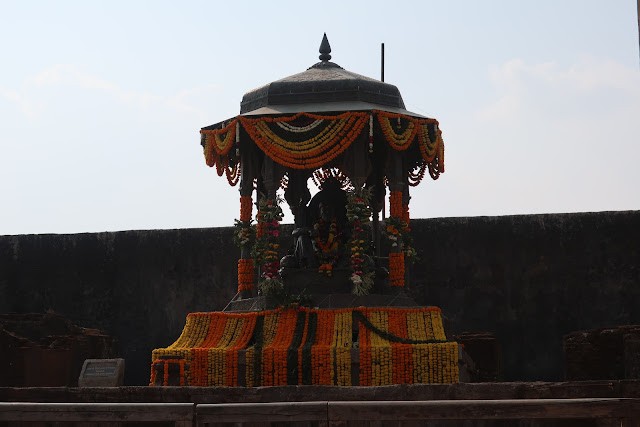 The Samadhi (tomb)of the great King lies in front of the temple. The tomb was discovered in 1880, almost 60 years after the fort was abandoned and then renovated in 1895 to its present state. Next to it is the tomb of Waghya, his loyal dog who supposedly jumped into the King's pyre after his master. There is some controversy going on regarding the veracity of the existence of Waghya and today the canine's samadhi is being protected by the ASI.Amidst all these architectural marvels, lies the natural marvel of Takmak Tok, a place of execution from where the guilty were thrown off the cliff to carry out a death sentence. This place experiences such high velocity winds that it is difficult to stand on the cliff lest alone peer down the steep valley. The point today is safeguarded with railings and is a popular tourist point. Legend has it that one of Shivaji's guards who was holding his umbrella (chhatri) could not withstand the velocity of the wind and was blown away from the cliff. However, as luck would have it, he clung on to the chhatri like a parachute and safely landed at a place below known as Nizampur - which has been duly renamed as 'Chhatri Nizampur' village since then.