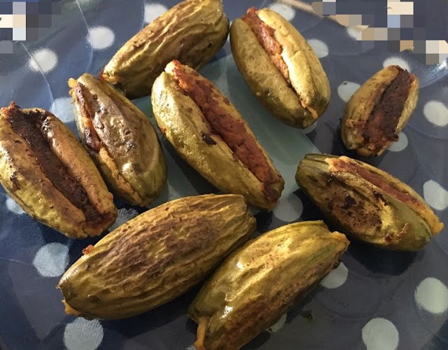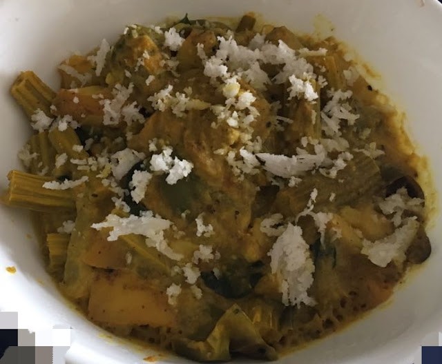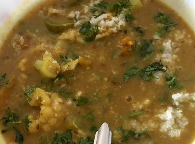 Friend ho to aisi .... A dear friend from our potluck group invited all of us for a grand Odia vegetarian feast to her place. The spread was really sumptuous as she had made 8-10 dishes right from scratch, each one being as different and as fabulous as the other. In short, she made us taste all the lovely, diverse flavours of Odisha, right from the chatpata starter to the rich cheesy dessert :) The lavish spread Odia cuisine - a divine celebration of food with diversity For beginners like me, it was a gastronomic revelation to be introduced to this grand and unique cuisine. Having been a Mumbaikar, I have always relished Maharashtrian, Kannadiga, Tam-Brahm, Gujarati and North Indian foods of our country. However, as I figured out, Odisha, the land of Lord Jagannath, rich in its culture and traditions, has an abundant variety of food items to offer to us lesser mortals. Odia cuisine typically uses less oil and spices as compared to the other regional cuisines of India. The subtle use of spices like pancha phutana and the gentle, less greasy cooking methods employed, allow the flavours of the main ingredients to float through. In the days of yore, it is said that Odia cooks were in great demand all over East India as they would cook as per the Hindu scriptures and as per the required norms of purity. Many such cooks were employed in Bengal in the 19th century who took with them many Odia dishes beyond the borders of Odisha and eventually popularised it all over India. One such famous export is Rasogolla whom we inadvertently consider it to be of Bengali origin. :) However, rasogolla was invented in Puri to be served as a bhog at the Mahalaxmi temple, as is the 700-year old temple tradition. Thanks to the influence of the bordering states, a wide healthy variation is observed within the Odia cuisine itself. Use of mustard oil, mustard paste, badi, coconut, yoghurt, jaggery, dry mango and pancha phutana (rai, jeera, methi, saunf and kaala jeera) is seen which typically coincides with the flavours of Bengal while the use of tamarind, curry leaves, hot chillies and the fondness of vadas (locally called baras) emanate from the neighbouring Andhra Pradesh. To add to this variety, the Lord Jagannatha temple at Puri, greatly influences its cuisine in and around the Puri and Cuttack region. The mahabhog served at the temple, especially the chappan bhog (56 dishes offered to Lord Jagannatha) which abstains from the use of onion and garlic, is simply mind blowing and one definitely has to taste the bhog at least once in his or her lifetime! My friend also revealed that being a coastal state, fish is another protein staple in a lot of preparations. Our lavish feast Now without much ado, let me introduce you to the vegetarian feast that we enjoyed last week. For the starter, she had made the ever popular street food of: Dahi bara alu dum guguni chaat : As the name suggests, this chaat is a combination of fermented udad dal bara (vada) soaked in salted, watery curd and a spicy potato curry (alu dum). This is topped with guguni, a green peas (usually with white peas) curry, sev and an assortment of sweet, sour and spicy chutneys. After whetting my appetite with the starter, I just couldn't wait to move on to the main course. She had a prepared a variety of vegetables and dal to be eaten along with rice and rotis. Rice is a staple in Odisha and vegetables such as potato, yam, bitter gourds, pumpkin, brinjal, ridge gourd, drumsticks, banana flower and stem are quite common. Kalara patua Our ancient Indian wisdom recommends starting off our meal with bitter foods. The bitterness stimulates digestive juices and apparently aids in digestion...and here I started off with Kalara patua. This dish is made by steaming the bitter guard inside a pumpkin leaf or colocassia leaf, which imparts its own delicate flavour to this dish. Spices such as mustard paste, turmeric, onions and chillies are mixed together with the minced vegetable and then stuffed inside the leaves. This preparation is traditionally cooked inside a burning chulha where I suppose, the leaf gets charred from outside and lends a nice smoky flavour to the karela. (Odia folks, please correct me if I am wrong :)). Small fishes and mushrooms are the favourites for this particular type of cooking method. Gota bhara potala Potala (Parval or pointed gourd) is a summer vegetable which can be cooked in a variety of ways. This recipe calls for a stuffing with mustard paste and potato and then it is shallow fried. Bitter gourds are also cooked in a similar way. Another flavourful dish made from parval is the Alu potala rassa. It is a must-required dish in all Odia feasts and consists of potatoes and pointed gourds in a spicy rassa (curry) made by grinding the whole garam masalas with ginger, garlic, coconut and cumin. Alu potala rassa Janhi alu posta Ridge gourd (Janhi) and potato are cooked with poppy seed paste (posta) in this particular dish and as per the traditional cooking style, turmeric is not to be used along with posta. Khajuri tomato khata This is a sweet and sour tomato chutney where the sweetness of the dates and raisins balances the sourness of the tomatoes; and nuts like cashews lend the scrumptious crunch. Besara The masala of Besara is usually a blend of mustard seeds with garlic and other spices such as garam masalas, jeera or saunf. This particular preparation of masalas is widely used for a variety of vegetables. Dry mango (ambula) is usually used to add tanginess, and a plethora of vegetables (as you see in the pic like drumsticks, radish, brinjal, pumpkins, eggplant, raw papaya, etc) are used to give a nice melange to this dish. Dahi baingan The Dahi Baingan is another gem from Odisha's rich repertoire of culinary heritage. In this recipe, the slices of brinjal are first fried, and then cooked in a curd based gravy with minimal spices and a little jaggery to balance the tartness of the curds. Here too, the pancha phutana is required to giv