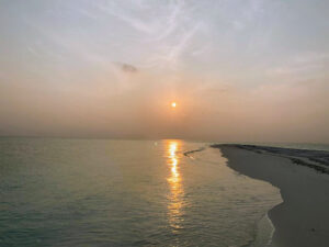 We were on a vacation in a resort bubble - partially disconnected from the outside world. Don't get me wrong here - the wifi was good and we did not need to buy any sim while in the Maldives. I didn't have to worry about cleaning my house, fixing my meals or even wearing masks - yet, I could not sleep late into the mornings. I, on most mornings, ended up waking before 7 am just when the sun was rising in the horizon. My most favourite activity in the morning was to walk barefoot on the sands along the beach. The white sands were soft to walk on and felt like a soft carpet. I saw a stork at one particular spot on the beach every day for my entire duration of stay. It stood on one leg, patiently, for a long time to get its catch of food. I appreciated that sight daily against the backdrop of the rising sun and the waves lashing at my feet. Shoals of fishes wandered along with the waves very close to the beach. During low tide, we spotted many amazing fishes in the reef waters. Not to speak of the varied-hued corals dancing below the stilts in the reef.