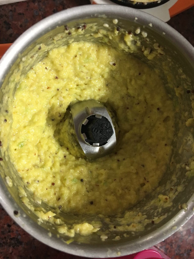 Here goes the recipe... Ingredients: 1 cup cooked long-grained rice (left-over white rice can also be used) Salt to taste To be ground into a paste (without addition of water): 1 medium-sized raw mango 5 tbsp of fresh grated coconut 1-2 green chillies (One can skip this and increase the quantity of red chillies in the seasoning) 1 tsp sesame seeds 0.5 tsp mustard seeds Seasoning: 3 tbsp peanut oil 1 tsp mustard seeds 2-3 de-stemmed red chillies, A sprig of fresh curry leaves 1.5 tsp udid dal 1 tsp chana dal 0.5 tsp methi seeds ( I skipped it) 2 tbsp peanuts 1 tsp haldi powder Asafoetida - a pinch Recipe: Make sure that the rice you are using is cooled and that the grains are not sticking to each other. Start off by preparing the paste and keeping it ready. The paste should be of the following consistency and thick: Next, in a kadhai, heat the oil and add the udid dal, chana dal, peanuts. When the dals change color, add the remaining ingredients under seasoning and fry a bit. To this oil, add the ground paste and cook it for 3-4 minutes till the masala gets cooked. Add rice and salt and mix well.