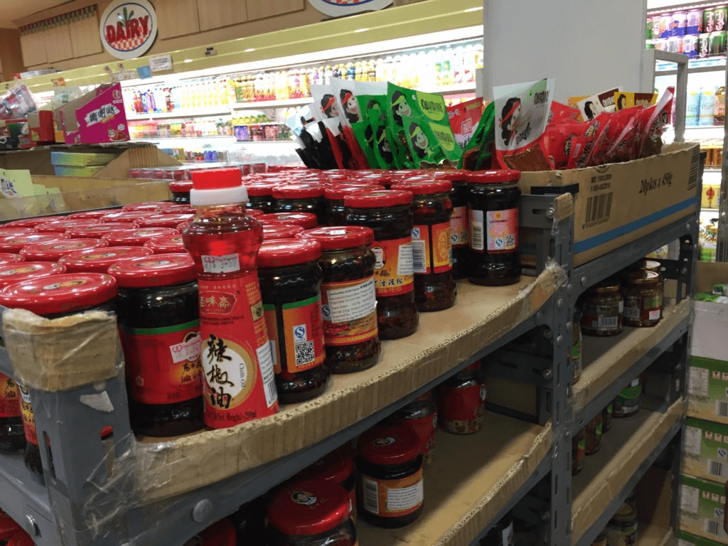 Chilli oil and chilli paste on the shelves |