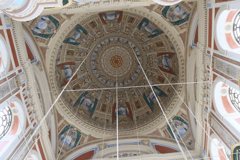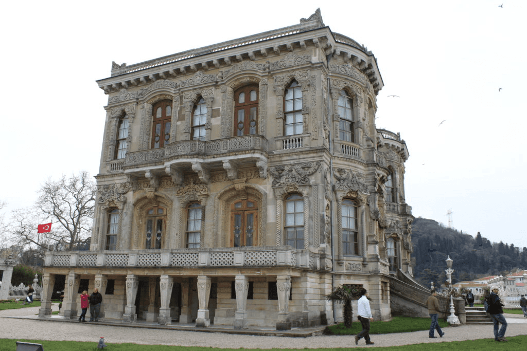 We had a quick dinner of Mezes (local word for appetizers) in a nearby Turkish restaurant. Being a vegetarian, left me with very little options on the first day. I ordered some falafel and hummus. The bread was complimentary. It was a big roti like bread sprinkled with a variety of seeds, including sesame seeds. The hummus which came with it was lip-smackingly delicious. Later, in my coming days, I found out that vegetarians do have plenty of food options in Turkey. Not only in a big city like Istanbul but elsewhere too. Its good to go green ;) Planning the Istanbul itinerary We still had to plan our 3-day stay in Istanbul. Our hotel owner was a friendly and helpful guy. He made us feel comfortable with all the little tips and pointers one needs to get around a new city in a new country. Not only he helped us book our Istanbul tours but he also helped us in booking the Cappadocia and Izmir tours! The Bosphorus Ferry Tour We decided to take the Bosphorus Strait Tour early in the morning the next day. We were picked up at our hotel in a bus and dropped near the ferry point.We were a group of around 12-15 people, all excited to start the tour. I was wondering how will I brave the biting cold on the open deck of the cruise. Hubby was insistent that we be on the open deck on the top floor to enjoy the view rather than be in the cosy warmth of the covered lower deck. I agreed. Our first halt was at the Ortakoy mosque , one of the most famous locations on the Bosphorus. It is a picturesque mosque with the Bosphorus bridge in the background. We stopped here for about 40 minutes and got ample of time to see the mosque and get some shopping done as well. The mosque is very pretty as you see in the pics below with beautiful in-laid tiles and decorated ceilings. The area near the mosque is lined with roadside shops selling knick knacks and other items. We were lucky to find some beautifully embroidered table cloths at a steal deal and a pair of gloves to help me beat the chill. The Bosphorus bridge joins the Asian side with the European side of the city. As we ferried on, we passed under the bridge to reach the Kucuksu Pavilion . This was the Sultan’s guesthouse during his frequent hunting expeditions and is now turned into a museum. It is a beautiful palace with intricate engravings and other motifs adorning the walls. We spent around an hour at this place clicking away to glory. Back on the ferry, we were treated to some delectable cookies and a sweet sherbet. Munching on the food, we were drinking in the beauty of the stunning views of the city.