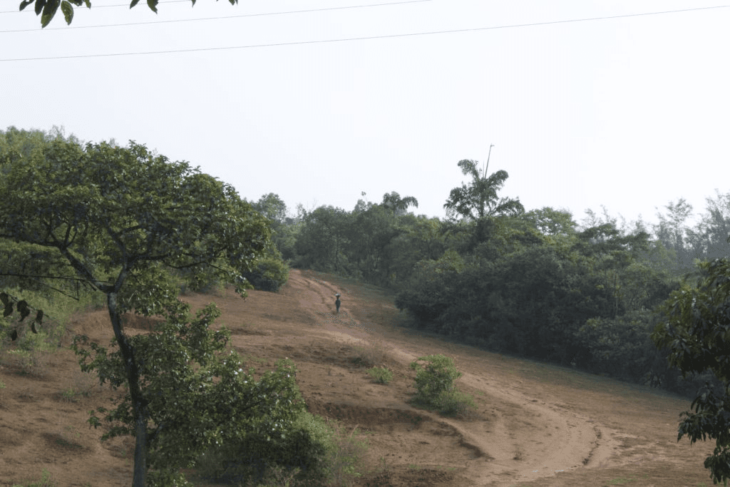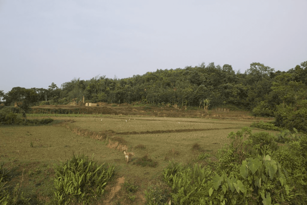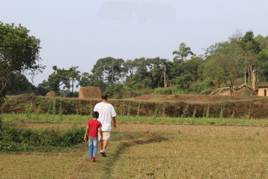 Evening came and we wanted to get out and explore the rural surroundings. Deciding to take a stroll nearby, we walked on and reached vast, rolling expanses of grasslands, without any civilization in sight. It felt magical to be in the middle of nowhere, with just small hills covered with lush green vegetation rising in the background. We proceeded along the mud path on the grassland and reached a small rivulet flowing through a few paddy fields. There was a small arch-shaped bridge, which helped us cross over to the paddy fields. It all seemed very charming and serene! Thatches of hay lay stacked in the paddy fields; a lone village woman making her way back to her village, seemed picturesque!