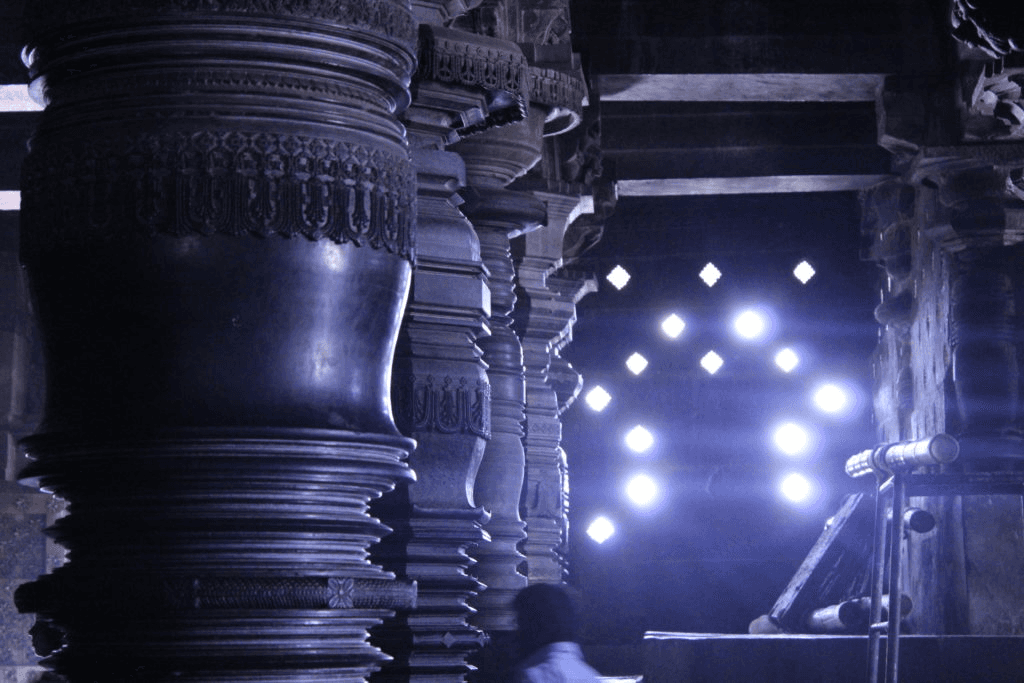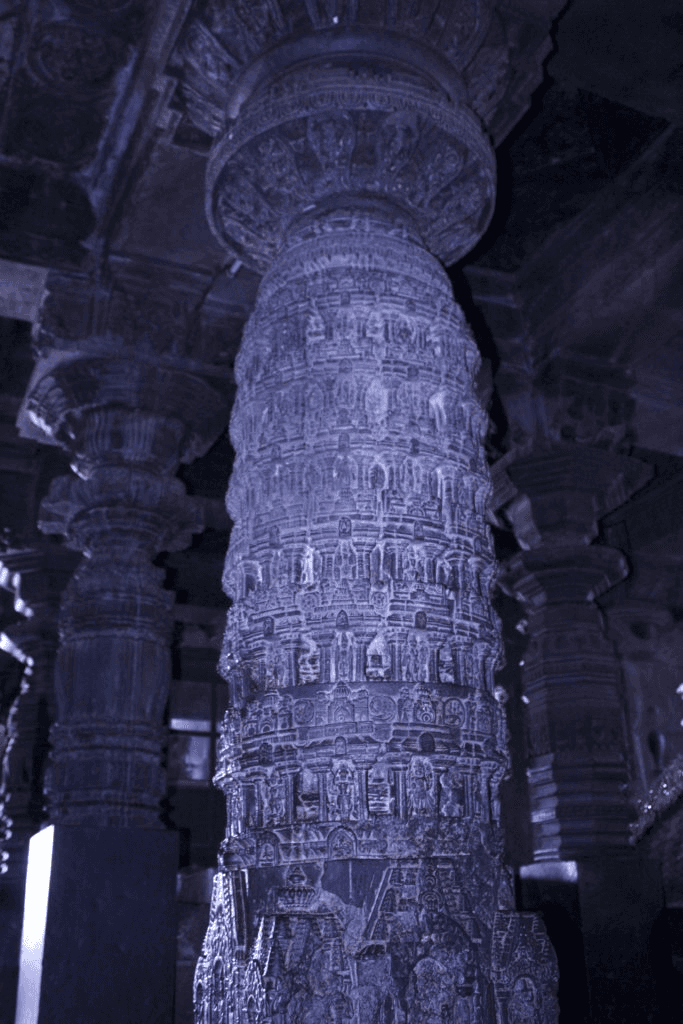 He explained all the sculptures and carvings on the temple gopuram, and on the walls, in detail. He was an expert in his work – I guess practice made him talk perfectly in a rhythm non stop! The lady with the mirror; the queen who danced on the pedestal in front of the main shrine; the fashion (saaj shringar) in those days; all these and other stories carved on the temple walls fascinated us. The soapstone carvings are so intricate that the temple indeed seems to be decorated with a filigree all around it.We were mesmerized by the architectural beauty of the temple and were dumbstruck with the intricate carvings it has. One of the pillars near the sanctum sanctorum, actually used to rotate around its axis till some 200-300 years ago (Picture below). A architectural wonder, I must say!