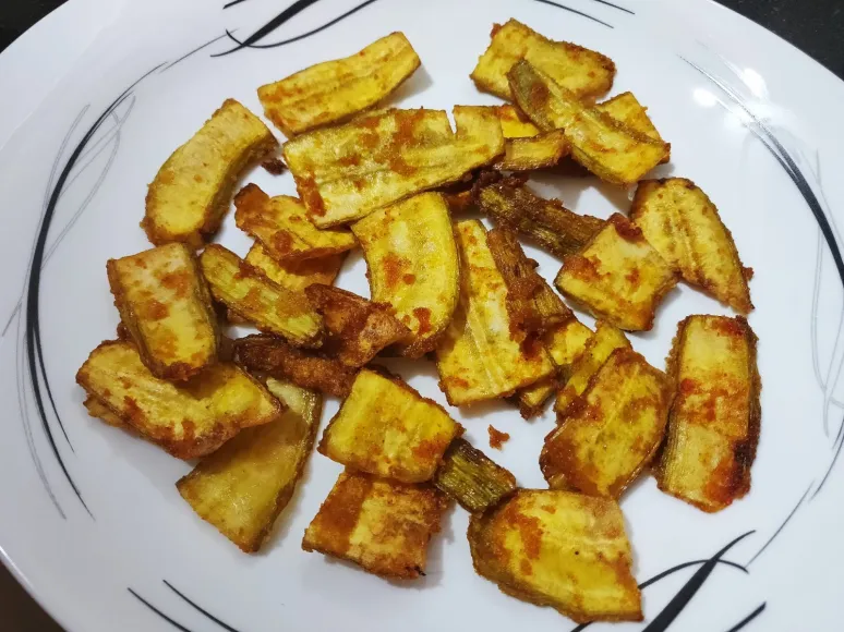 Made upperi today after a long long time. They are nothing but fried raw banana chips simply marinated with haldi, chilli powder and some salt. I added some rawa today to get that crispy texture. Upperi was always prepared in our house on festive ocassions. I remember my avva (grandma) slicing the bananas and dipping them in turmeric water to prevent them from turning black. The thinner you slice the bananas, the crisper you get the upperis. There used to be a tussle between the family members as to who gets the crisper ones served on their plate. However, I always preferred the softer ones which are cut thick. No tantrums ;) A simple, nutritious raw banana preparation associated with memories galore...do try making upperi at home.
