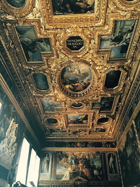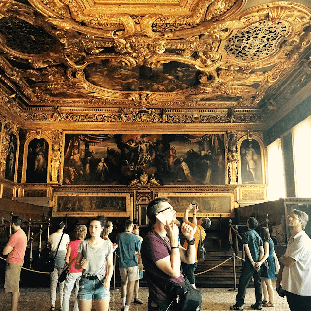 After a leisurely Italian lunch of pizza, pasta and tiramisu nearby, we wandered back to the square and decided to tour the Doge’s palace. Luckily for us, the queue for the entry to the palace wasn’t too big and we could get instant tickets to enter the premises. We opted for the audio guides as we did not want to be in huge tour groups and wanted our own time and space to marvel at the palace and its history. It took us more than 2 hours to tour the palace…the Courtyard, the Opera, the Doge’s apartments, the Golden Stairs, its Senate room, Secret chamber, Bridge of Sighs, Prisons, Armoury and other chambers. We slipped back into the olden times imagining how things would have been then in Venice.