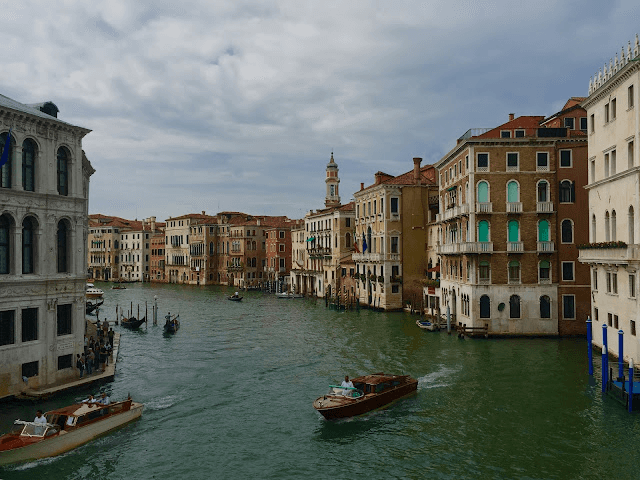 The view of the Grand Canal from the Rialto Bridge with water taxis and gondolas on it. Picturesque, isn’t it? |