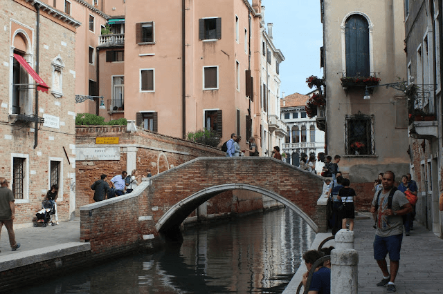 Water buses are a prominent mode of transport but Venice, still, is a pedestrian’s paradise. It is not a very big city and can be covered in a short time from one end to the other. From a tourist’s point of view, it is ideal to explore it walking and stopping at nooks and corners to enjoy it. There are hundreds of shops lined along the canals. Cafes, gelatos, delicious baked tidbits and beautiful souvenirs of Venetian masks, Murano glass wares and many others, all make this walk ever so fascinating. So, armed with google maps of Venice on our smart phones, we started unraveling this labyrinthine maze towards Rialto bridge. All the paths are conveniently marked with directions for the major touristy places, so getting a bit lost here and there is not a big deal.